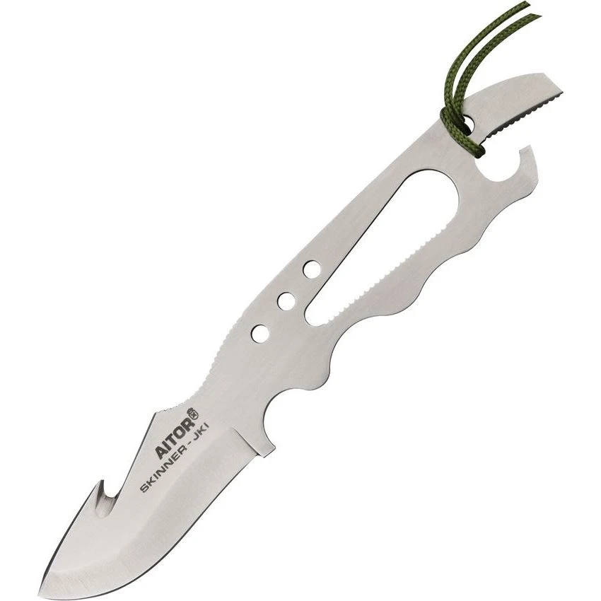 Model – AI16022. JKI Skeletal Skinner. 7 inch overall. 2.5 inch guthook blade. One piece stainless construction. Skinner features thumb ridge, ridged handle slot, lashing holes, flathead screwdriver end with bottle/can opener, OD green nylon lanyard. OD green canvas belt sheath with protective insert. Made in Spain.