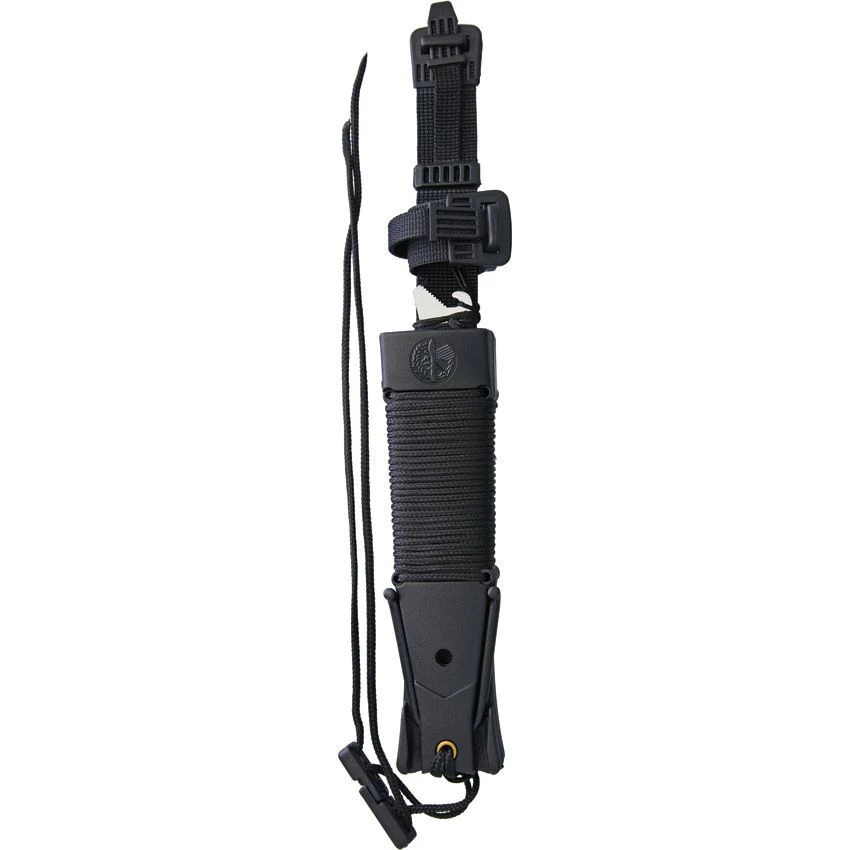 - Outside of sheath features several feet of nylon cord, black coated stainless metal arms at tip of sheath that flip out to serve as slingshot, and a sharpening stone on the back