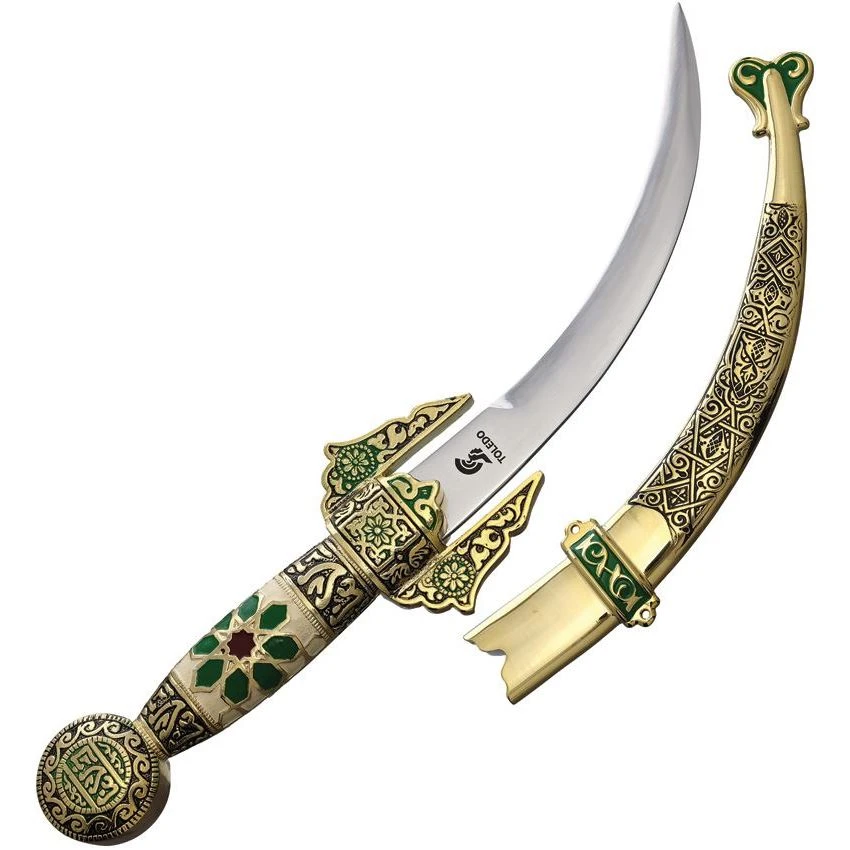 Model/Part Number – CI505. Art Gladius Arab Dagger. 13.5″ (34.29cm) overall. 7.5″ (19.05cm) satin finish stainless curved blade. Antique bronze metal alloy handle. Gold metal scabbard. Boxed. Made in Spain.