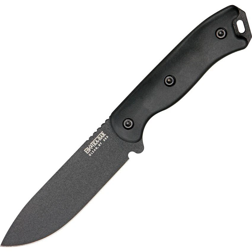 Model – BKR16. Short Drop Point. 9.13 inch overall. 4.38 inch black coated 1095 Cro-Van carbon steel drop point blade. Black Zytel handle. Full, extended tang. Lanyard hole. Includes an extra set of coyote tan handles. Cordura belt sheath.