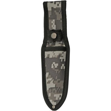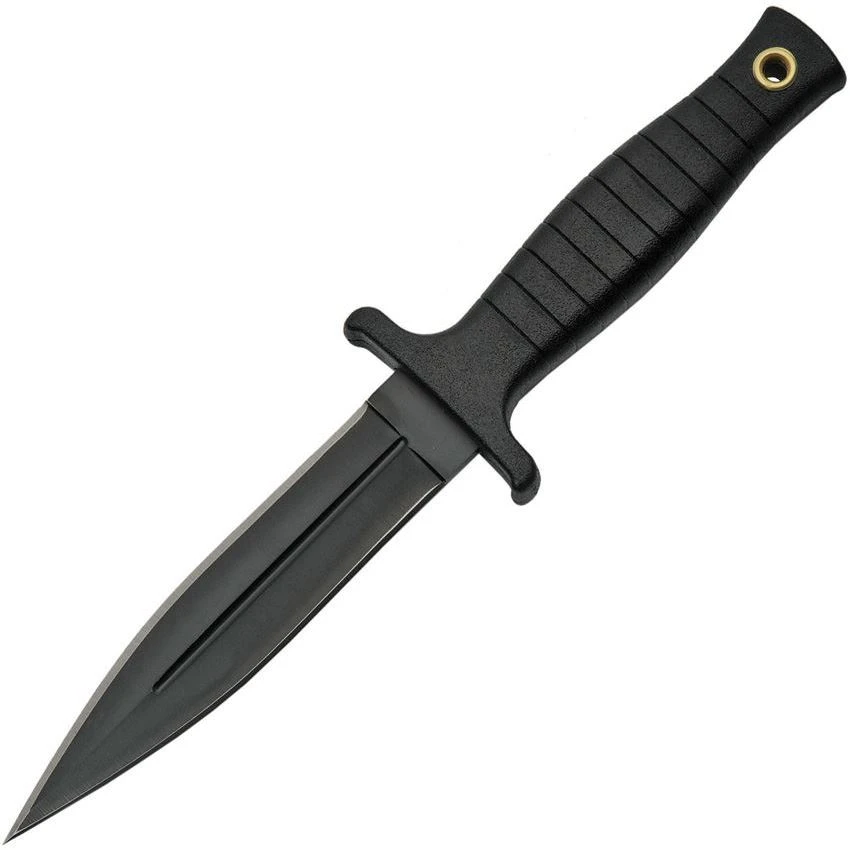 Model – CN211459CM. China Made 211459CM – Combat Boot Knife. 9″ overall. 4.75″ black finish double edge stainless dagger blade. Black ABS handle. Lanyard hole. Camo nylon belt sheath. Boxed. Made in China.