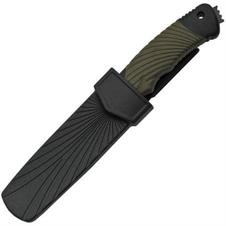 Model – CN211493PL. China Made 211493PL – Fixed Blade Plastic Handle. 9.5″ overall. 4.25″ black finish stainless blade. Black plastic handle with green rubber onlay. Glass breaker. Lanyard hole. Black plastic belt sheath. Boxed. Made in China.