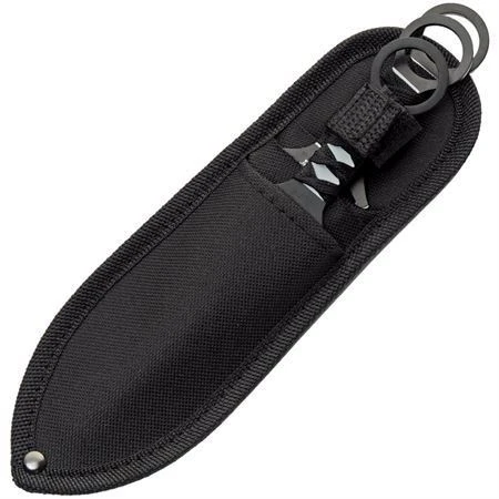 Model – CN211547. China Made 3pc Throwing Set. 7.75″ (19.69cm) overall. 4.25″ (10.8cm) two-tone finish double edge stainless blade. Black cord wrapped handle. Black nylon belt sheath. Boxed. Made in China.