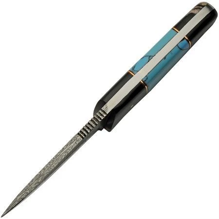 Model – DM1293TR. Fixed Blade Buffalo/Turq. 7.5 inch (19.05cm) overall. 4.5 inch (11.43cm) Damascus steel blade. Full tang. Buffalo horn and turquoise handle. Brown leather belt sheath. Boxed. Made in Pakistan.