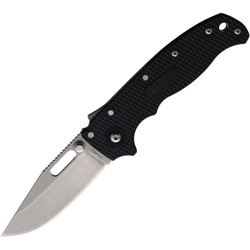 - 3.25″ (8.26cm) stonewash finish D2 tool steel clip point blade