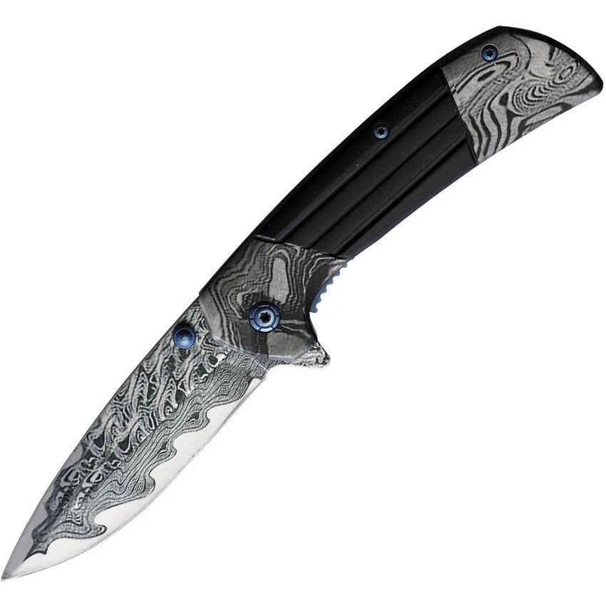 Model – EE10A54BKD. ElitEdge Damascus Etched Linerlock A/O. Assisted Opening. 4.65″ closed. Damascus etched stainless steel blade. Black and damascus etched stainless steel handle. Belt clip. Made in China.