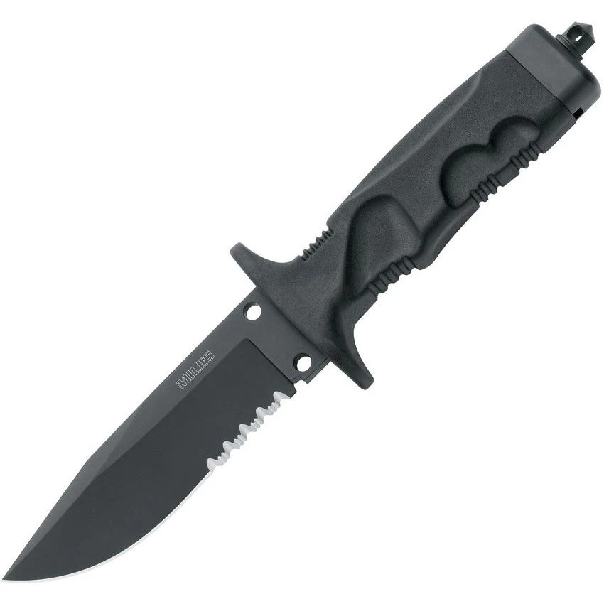 Model – FOX0171104. Fox 0171104 – Miles Combat Trooper. 10.88″ (27.64cm) overall. 5.25″ (13.34cm) black PTFE coated partially serrated Bohler N690 stainless blade. Black Forprene handle. Glass breaker. Lashing holes. Black Kydex belt sheath. Boxed. Made in Italy.