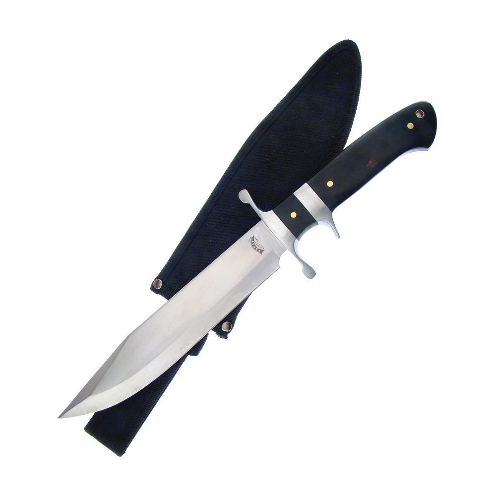 Model – F18316BPW. Frost Bowie Black Pakkawood. 16″ overall. 10″ satin finish stainless clip point blade. Black pakkawood handle. Stainless guard. Full tang. Lanyard hole. Black nylon belt sheath. Boxed. Made in China.