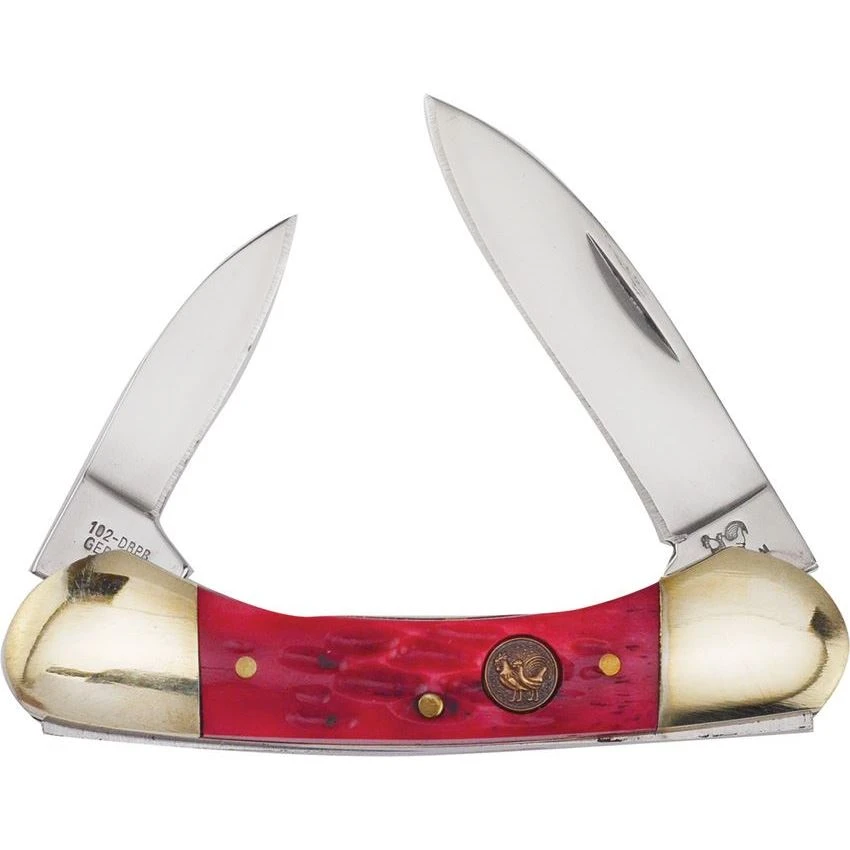 Model/Part Number – HR102DRPB. Hen & Rooster Knives Small Canoe Red Bone. 3.25″ (8.26cm) closed. Mirror finish stainless spear and pen blades. Dark red pick bone handle. Nickel silver bolster(s). Inlay shield. Boxed. Made in China.