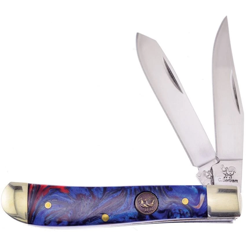 Model/Part Number – HR212STAR. Hen & Rooster Knives Small Trapper Resin. 3.5″ (8.89cm) closed. Mirror finish stainless clip and spey blades. Red, white, and blue resin handle. Nickel silver bolster(s). Inlay shield. Boxed. Made in China.