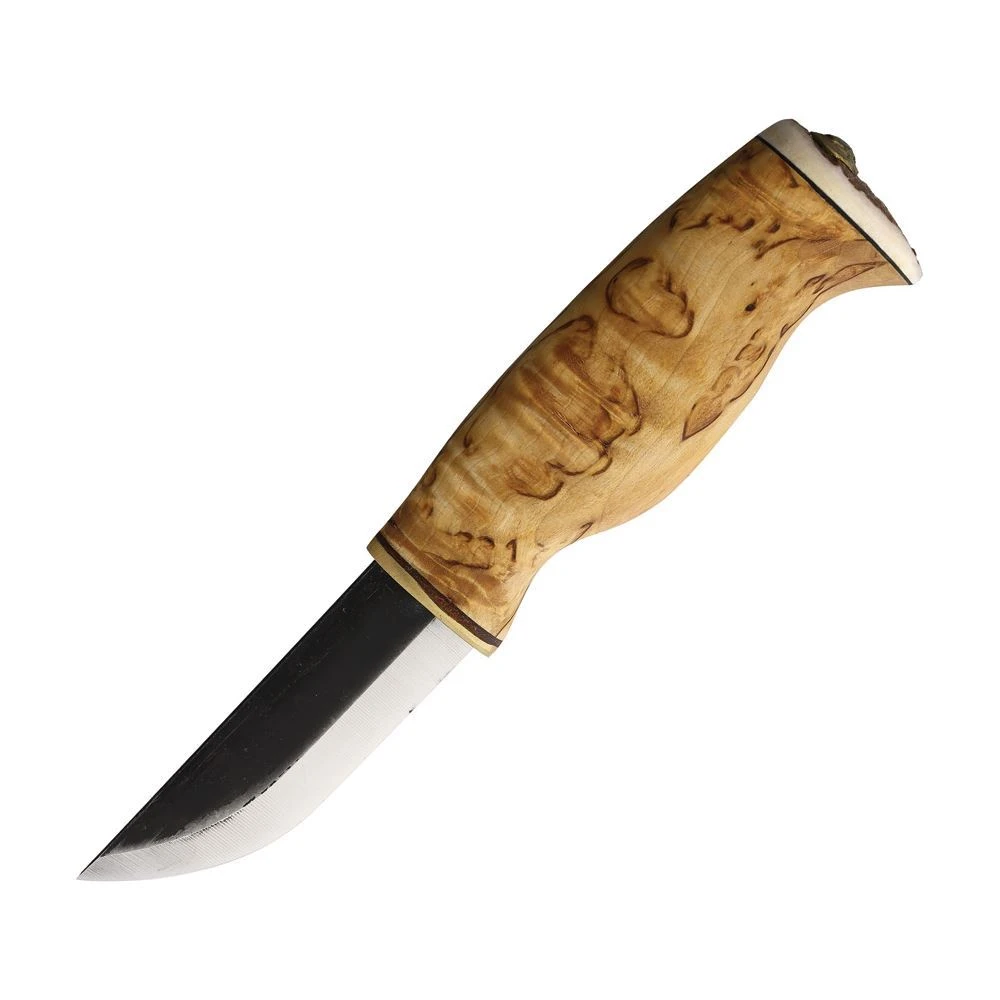 Model – KLKT23N. Kellam Tundra Skinner. 8.5″ (21.59cm) overall. 3.5″ (8.89cm) carbon steel blade. Curly Birch handle. Reindeer horn pommel. Brown leather belt sheath. Bulk packed. Made in Finland.
