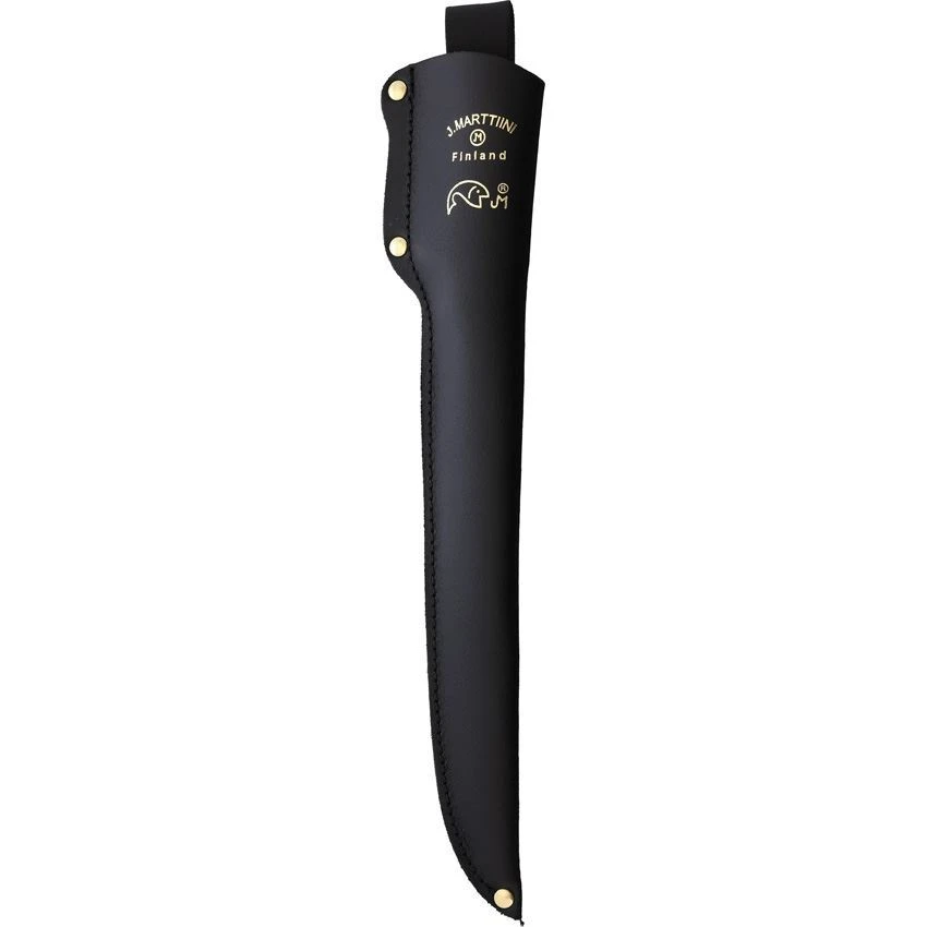 Model – MN846014T. Martef Fillet w/Leather Sheath. Martef Fillet. 14.13 inch overall. 9 inch black finish stainless fillet blade. Blue textured rubber handle. Plastic ferrule. Black leather belt sheath. Bulk packed.