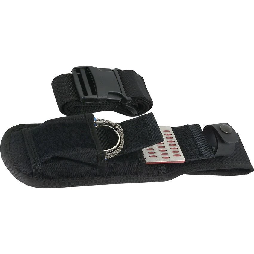 Model – MAS925G10N. Maserin Diceros K.R.L.. 11.5″ (29.21cm) overall. 5.5″ (13.97cm) stonewash finish D2 tool steel tanto blade. Black G10 handle. Full, extended tang. Lanyard hole. Shoulder sling. Comes with diamond sharpener and survival wire saw. Black nylon belt sheath. Boxed. Made in Italy.
