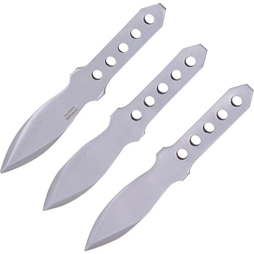 Model – PA3120. Throwing Knives Fixed Blade Knife. Contains three 5 inch overall knives with 2.5 inch doulbe edged blades. One piece all stainless construction. Black nylon belt sheath. Made in Pakistan.