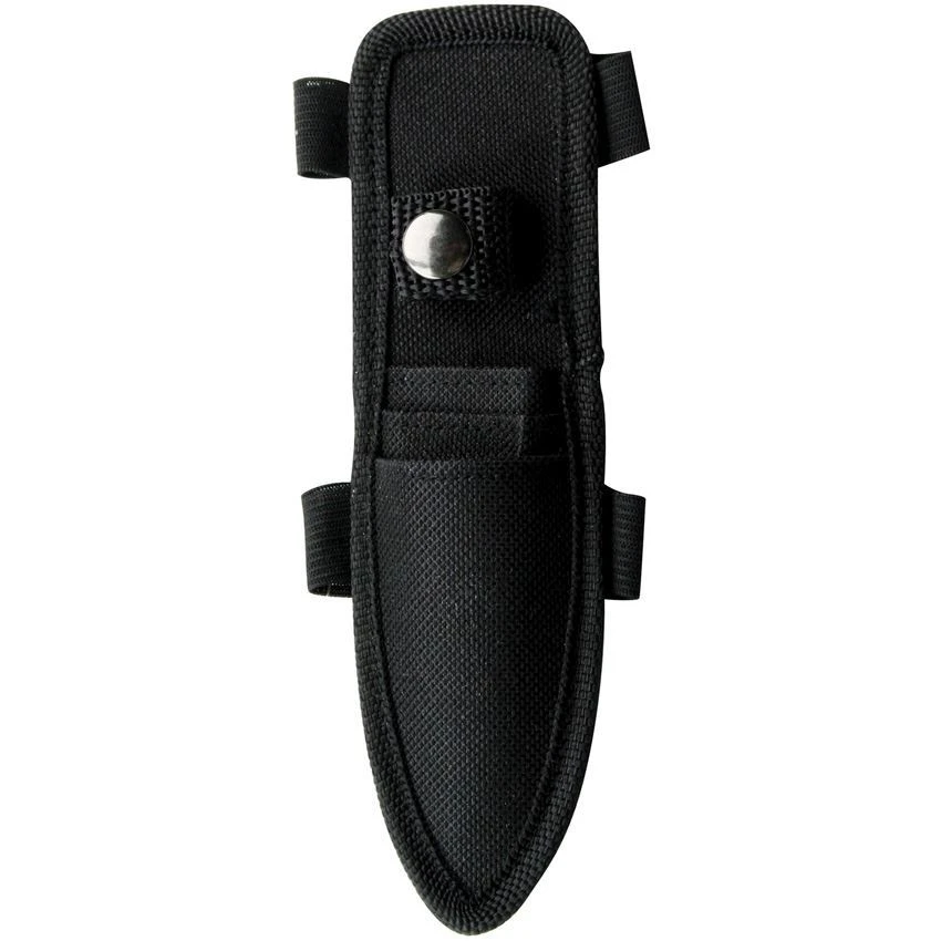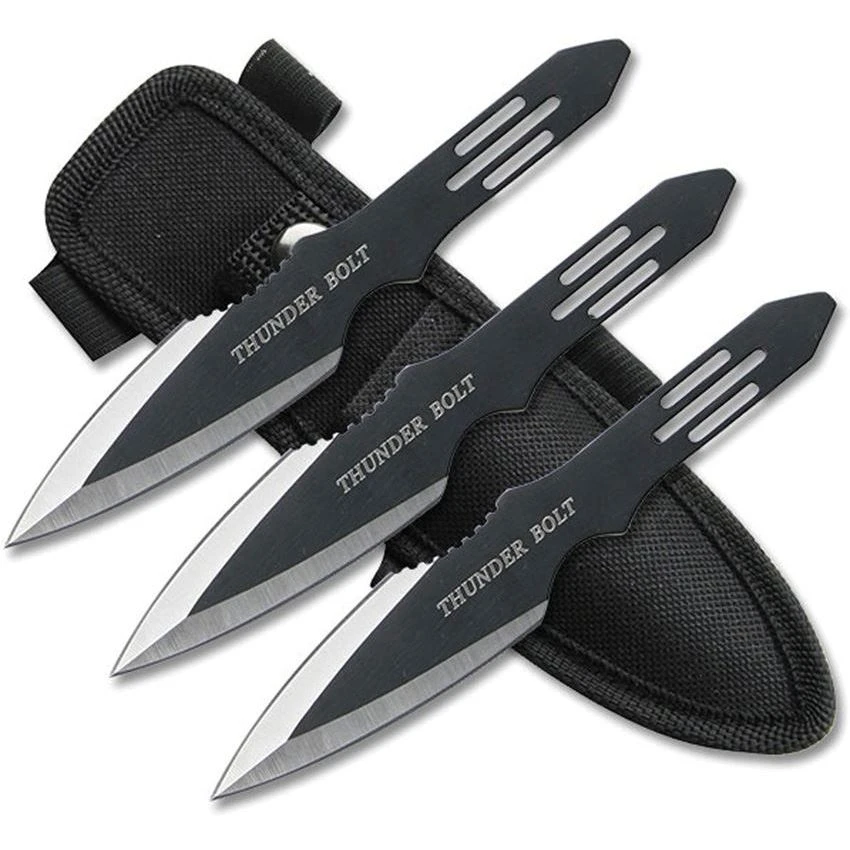 Model/Part Number – M4503. Perfect Point Throwing Knives Throwing Knife Set. 5.5″ (13.97cm) overall. 2.75″ (6.99cm) two-tone finish stainless blade. One-piece construction. Set of three. Black nylon belt sheath. Boxed. Made in China.