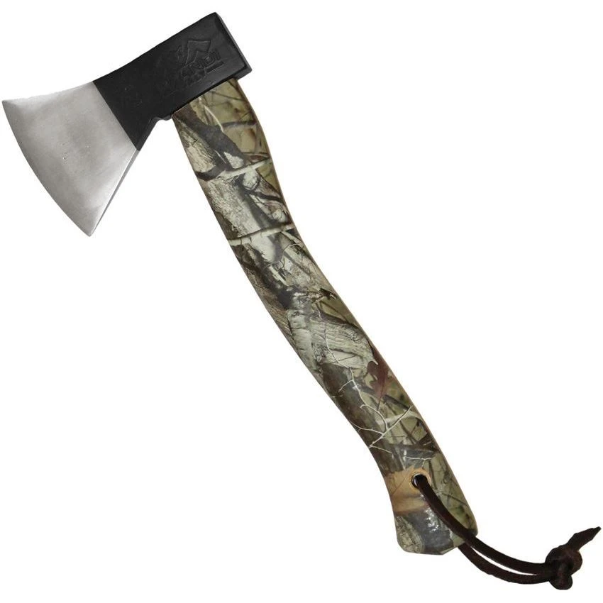 Model – PRAT0306D. Prandi T0306D – German Style Throwing Hatchet. 14.25″ overall. 6″ carbon steel axe head with 3.75″ cutting edge. Camo printed Hickory handle. 1.35 lb black and satin finish axe head. Bulk packed. Made in Italy.