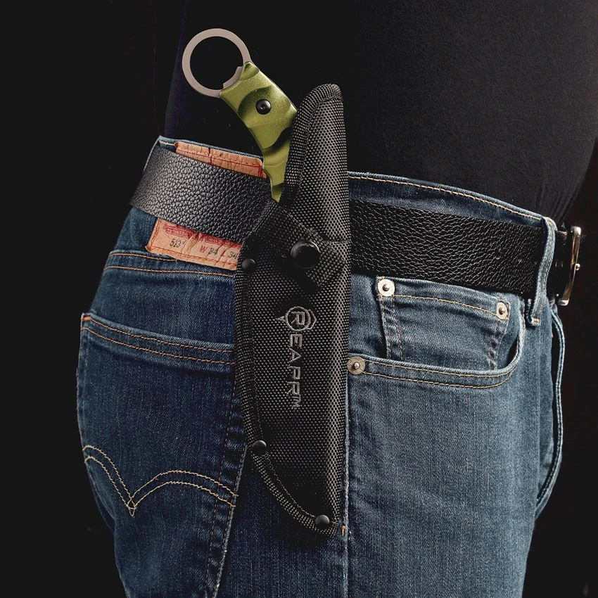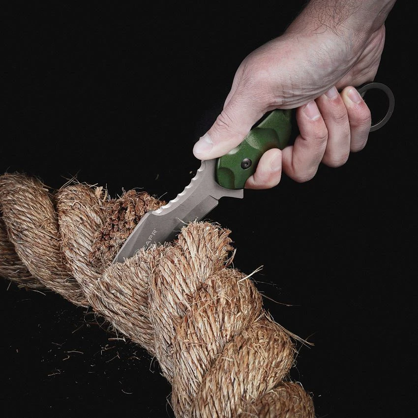 - 4.75″ (12.07cm) matte finish sawback 420 stainless modified spear point blade