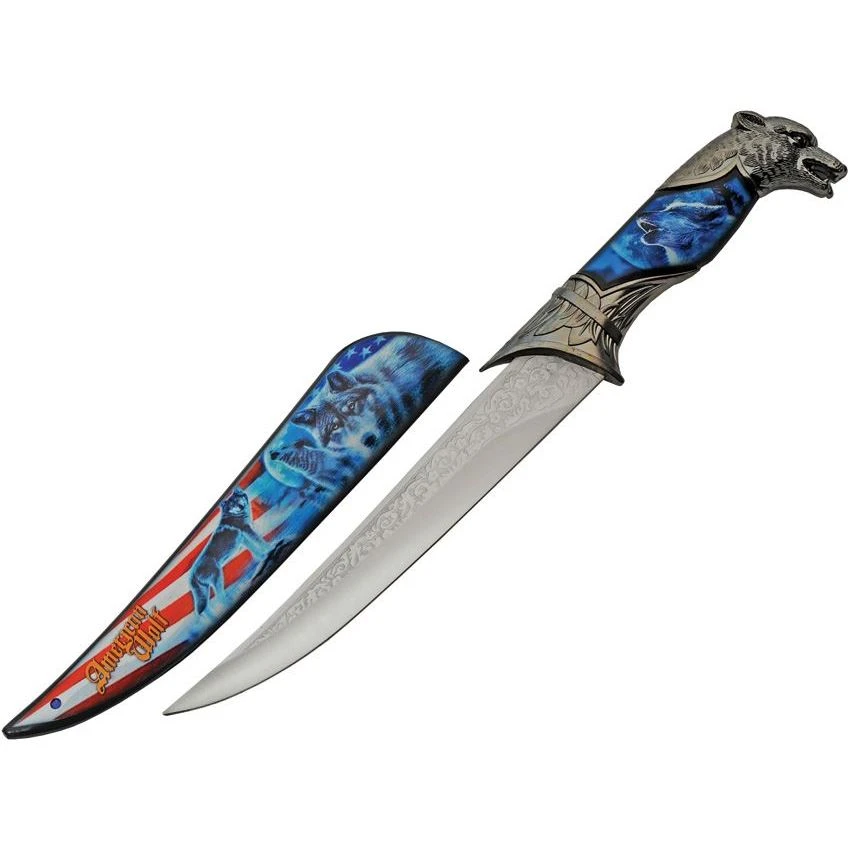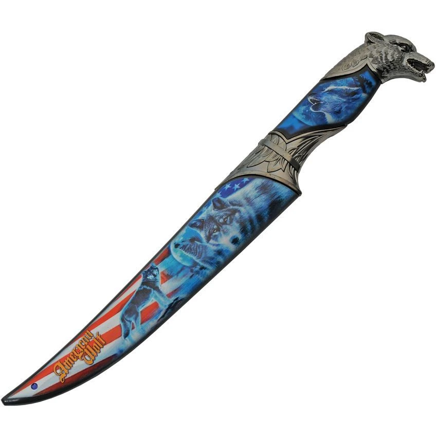 Model – CN211528. Rite Edge American Wolf Dagger. 13.25″ (33.66cm) overall. 8″ (20.32cm) satin finish 420 stainless blade. Plastic handle. Wolf shaped pommel. Wolf artwork on handle and sheath. Plastic sheath. Boxed. Made in China.
