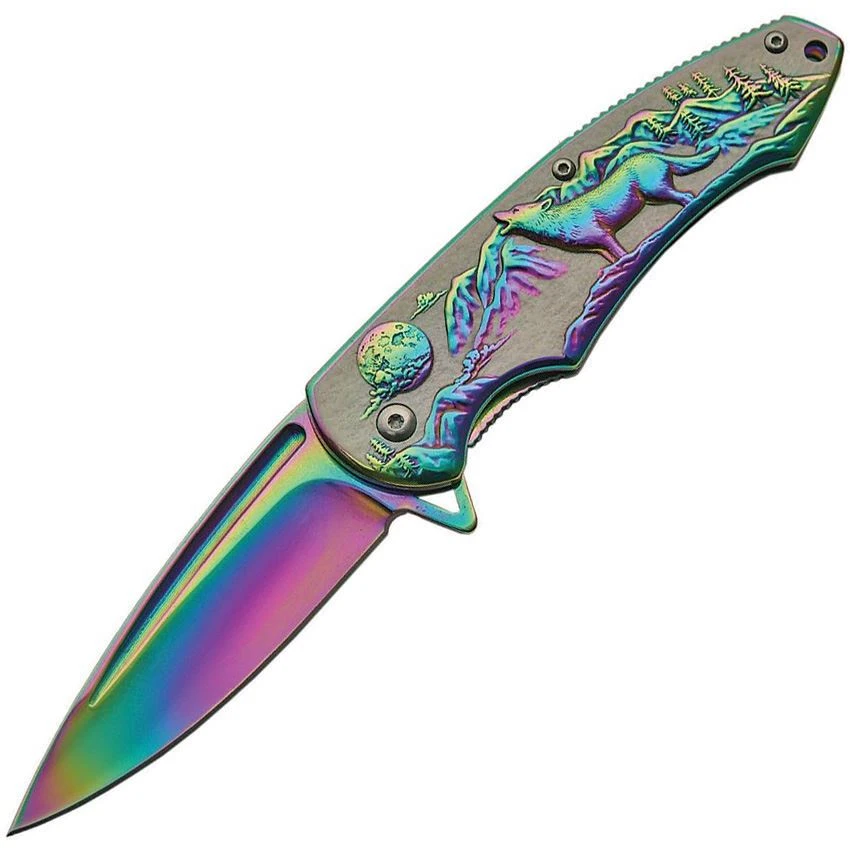 - Rite Edge 300403RB – Wolf Rainbow Assisted Opening Framelock Folding Pocket Knife