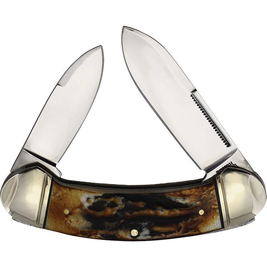 Model/Part Number – RR2428. Rough Rider Bow Canoe Cinnamon Bone. Cinnamon Bone Stag. 3.75″ (9.53cm) closed. Mirror finish carbon steel spear and pen blades. Cinnamon stag bone handle. Nickel silver bolster(s). Made in China.