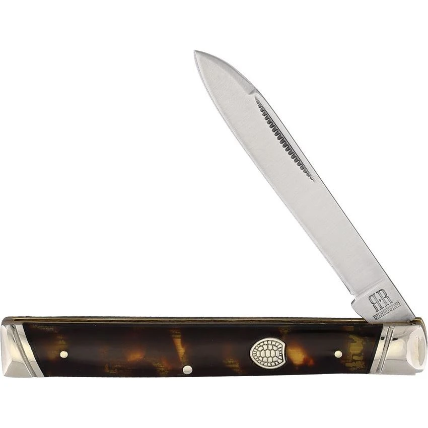 Model/Part Number – RR2438. Rough Rider Knives Doctor’s Knife Imit. Tortoise. Tortoise Shell Series. 3.63″ (9.22cm) closed. Satin finish stainless long pen blade. Imitation tortoise shell handle. Nickel silver bolster(s). Inlay shield. Boxed. Made in China.