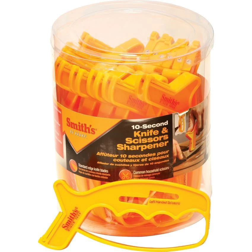 Model – AC19007. Pocket Pal Counter Display. 6 inch overall. Yellow plastic handle. Plastic tub for counter top display. Contains 12 Pocket Pal knife sharpeners. Sharpener features carbide and ceramic rods. Can sharpen left and right handed scissors. Boxed.