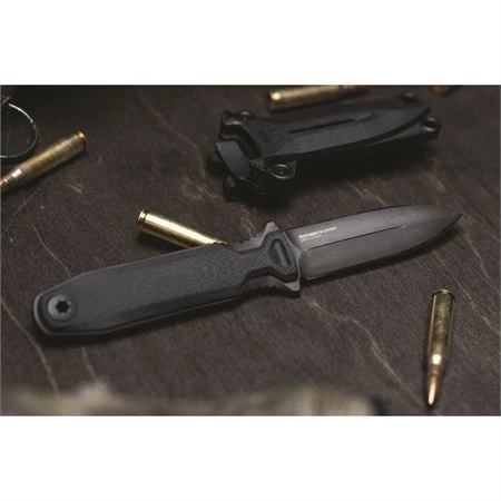 Model – SOG17610357. SOG 17610357 – Pentagon FX Covert. 7.5″ (19.05cm) overall. 3.5″ (8.89cm) black TiNi coated S35VN stainless blade. Black G10 handle. Full tang. Fully ambidextrous carry. Handles are removable. Universal mounting system. Black GRN MOLLE compatible belt sheath. Boxed. Made in Taiwan.