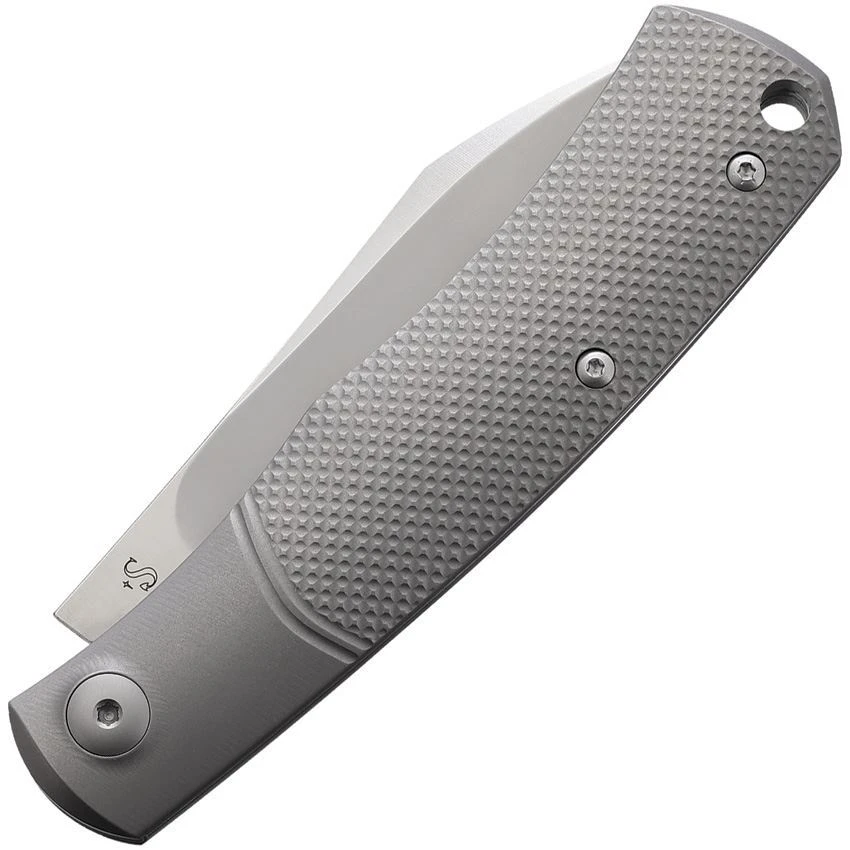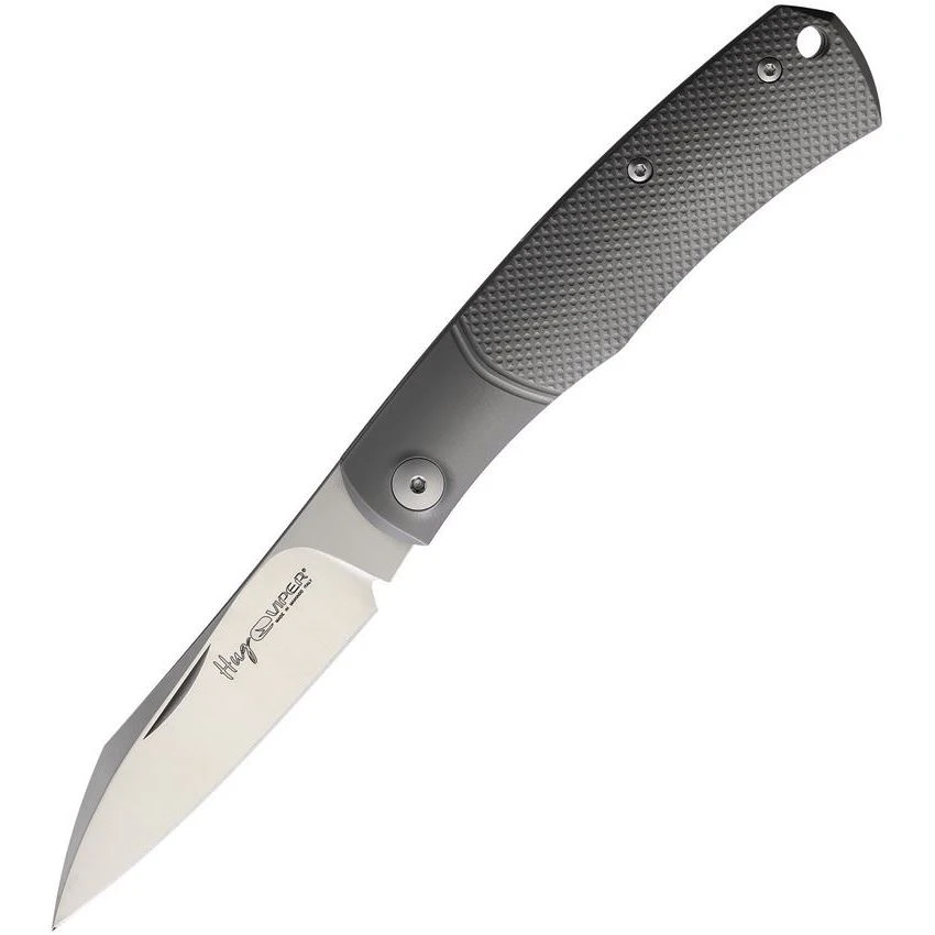 Model – V5990TIG. Viper 5990TIG – Hug Folder Geometric. 7.2 inches (184mm) overall. 3 inch (71mm) Böhler M390 modified wharncliffe blade with satin finish. Rounded steel spring. Titanium handle with geometric design. Leather sheath. Designed by Sacha Thiel. Made in Italy.