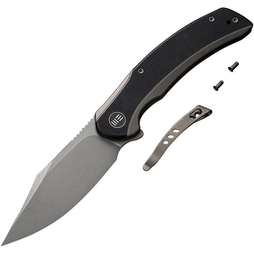 Model – WE19022F1. We 19022F1 – Snick Framelock Black. 4.5″ (11.43cm) closed. 3.5″ (8.89cm) stonewash finish CPM-20CV stainless blade. Gray titanium handle with black G10 onlay. Extended tang. Pocket clip. Black nylon zippered storage case. Boxed. Made in China.