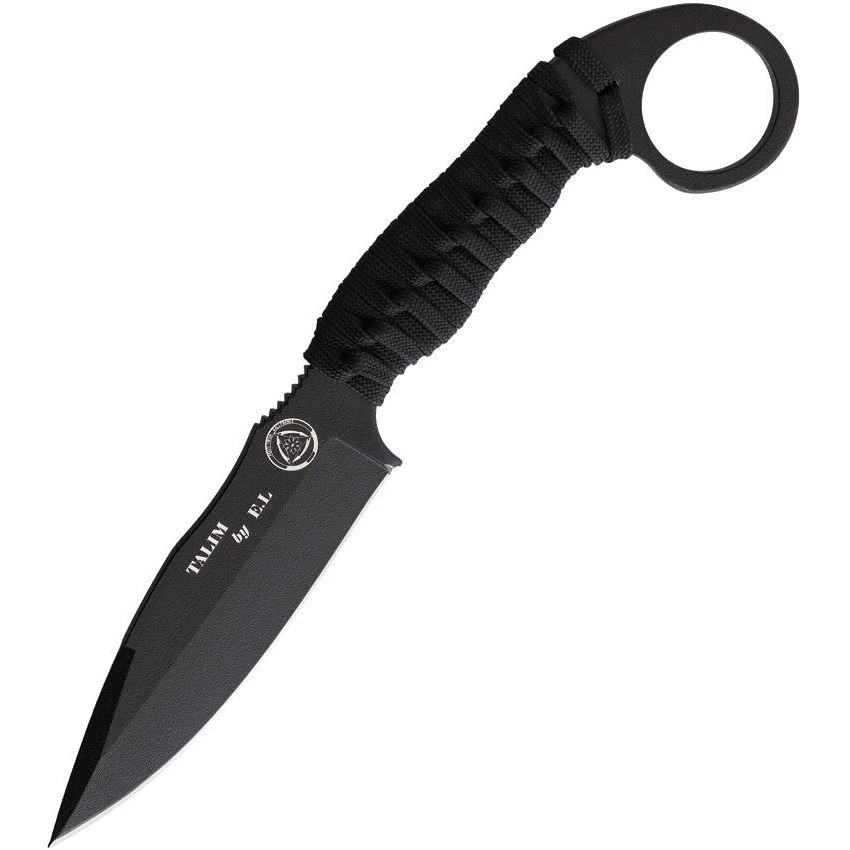 Model – WSTAL3113. Wild Steer Talim Tactical Fixed Blade. 8.15″ overall. 3.816″ black 17C28N Sandvik steel blade. Black paracord handle. Black kydex sheath. Made in France.
