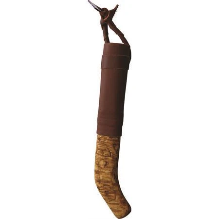 Model – WJ23VV. Wood Jewel Knives 23VV – Fixed Blade Curly Birch. 7.75″ (19.69cm) overall. 3″ (7.62cm) carbon steel blade. Curly Birch handle. Reindeer horn pommel. Horn spacers. Brown leather and curly birch belt sheath. Due to the natural materials used, knife dimensions could vary. Bulk packed. Made in Finland.